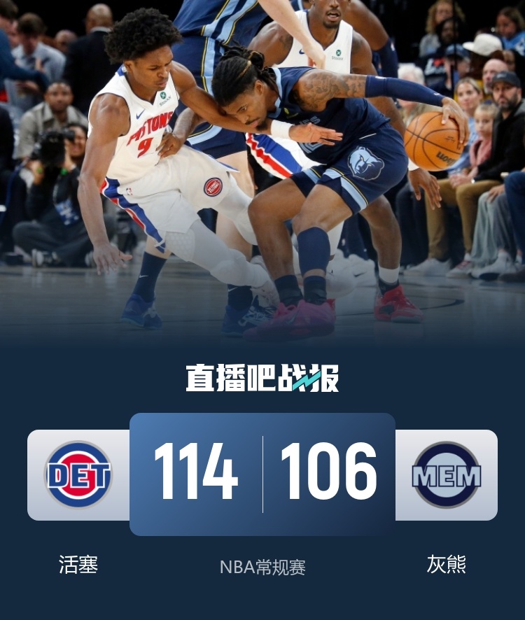 11月4日讯 NBA常规赛,灰熊主场对阵活塞,灰熊最近遭遇2连败,莫兰特经过一场禁赛后复出,活塞最近取得2连胜。