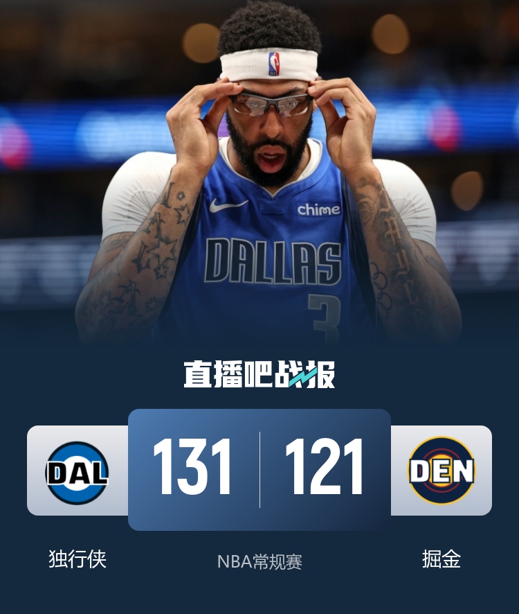 比赛上来,掘金在双核的带领下迅速打出9-2的开局,分差在开场三分钟就达到两位数,整个第一节他们狂轰41分,次节独行侠的进攻有所好转,双方一直围绕着十分左右的分差展开拉锯,但之后独行侠突然发力,在戴维斯的带领下一波攻势完成反超,这一节独行侠42分强势回击,半场结束时掘金反而落后1分;下半场回来,两队开始展开拉锯,都没能获得拉开分差的机会,比赛悬念保持到了最后,关键时刻掘金突然断电,独行侠在弗拉格的带领下将分差拉开到两位数,最终独行侠力克掘金迎来连胜。