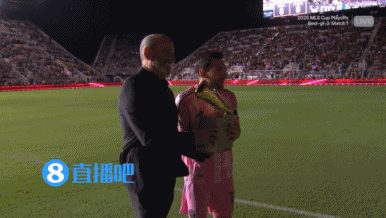 赛前,梅西领取美职联常规赛金靴奖杯。↓